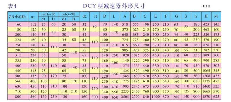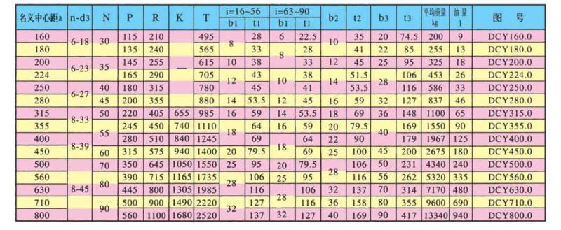 DCY、DCYK、DCZ型減速機各有15種規格,名義中心距為:160,180,200,224,250,280,315,355,400,450,500,560,630,710,800mm;每種規格均有11種傳動比(16,18,20,22.4,25,28,31.5,35.5,40,45,50)兩種旋向,四種裝配型式,分別組成660種減速機。